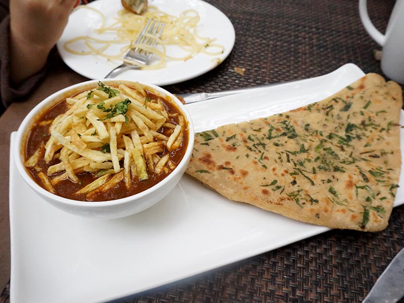 “parsi salli boti” The classic Parsi dish of mutton (goat) in a tangy mutton curry topped with shoestring fries (the Parsis are not into the healthy eating thing). Very nice.