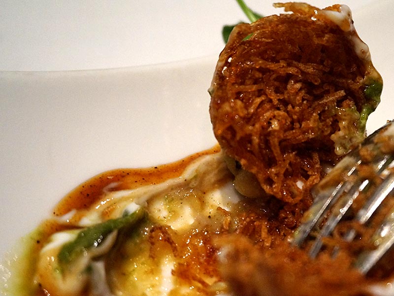 Close-up of the chaat. As you can see, the potato in this potato chaat is quite literally a sphere constructed from deep-fried shreds of potato (traditionally it would be cubes or slices of boiled potatoes). However, the time spent on the fussy preparation of the potato sphere had clearly not kept them from paying attention to the yogurt and chutneys–this tasted like a proper chaat.