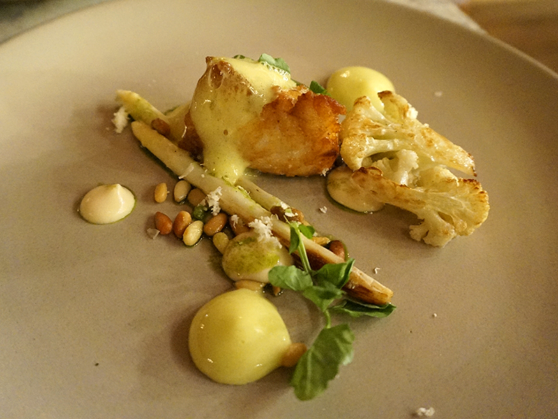 Roasted Monkfish. This was our server’s recommendation over the branzino and it was very good indeed. The monkfish was perfectly cooked and with the pine nut sabayon draped over it went very well with the roasted cauliflower. The pine nuts and the asparagus provided nice textural contrasts.