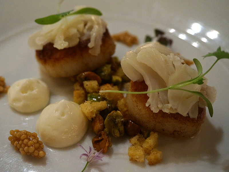 Piccolo: Seared Sea Scallops Published July 22, 2014, 14:36 at 800 × 600 in Piccolo: Seared Sea Scallops Third Course Seared Sea Scallops with pickled cauliflower, mustard seed and pistachio/brioche crumble. This was mine. There’s not a whole lot more to say about this other than that it was perfectly composed and balanced.