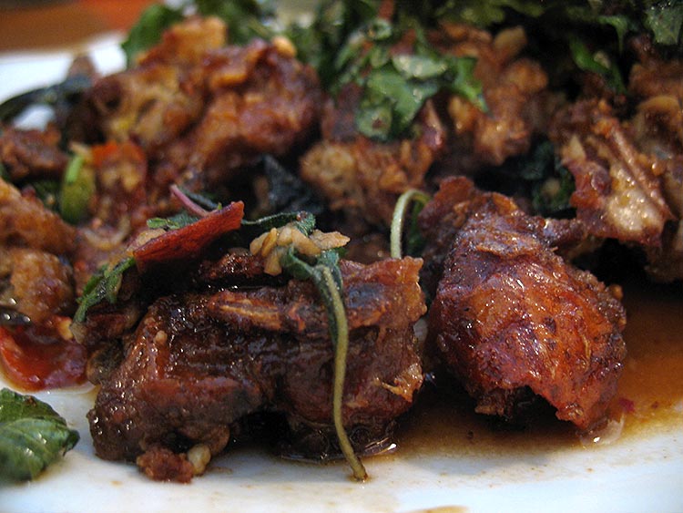 The soft shell crabs can be made in a number of ways but he recommended getting them spicy with fried mint leaves. We were happy to comply but while it was very good we preferred everything else to it. (This is not on the printed menu, by the way. It was recommended by the owner instead of the Kang Leang that we’d ordered blind; he told us that it was also a noodle/soup dish and we already had two in the Kao Soy and the Nam Ngeao.)