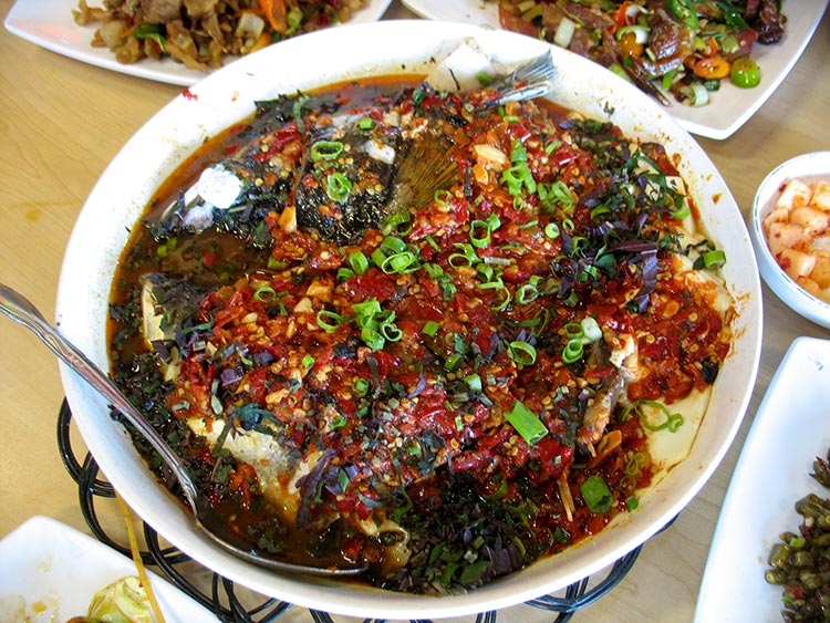 Steamed Fish Head: Did I say that the first fish arrived in a large bowl? Well, this arrives in a colossal bowl. In the bowl is a gigantic head of carp that has been split. It is swimming in a lovely broth (presumably the steaming liquid), and has an unfeasible amount of dry and pickled peppers scattered over it (and some herbs including shiso/perilla leaf). And it’s bloody good (though rather fiddly to eat). Our waitress had suggested getting this with tofu added on and it was a great counterpoint (it also added $2 to the price).