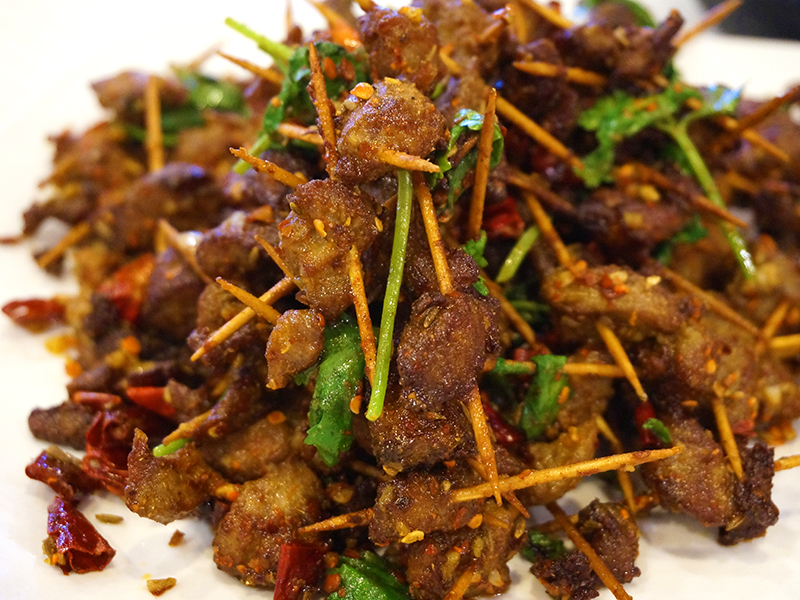 Toothpick Mutton. Mutton=lamb. Heavily redolent of cumin this could pass easily as a North Indian dish. The meat was tender yet crisp with just enough chilli bite to cut through the cumin and keep it from being cloying. This would be a great munching bar snack along with beer.