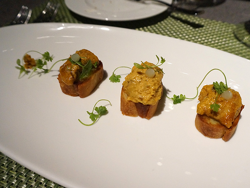 First Course: Raw Bar Published April 23, 2014, 23:26 at 800 × 600 in First Course: Raw Bar Uni On Toast, citrus kosho, fennel butter This was the missus’ and it was very disappointing. The uni was tired–no sweetness, no brininess–and the toast was soft and almost soggy. Someone should have been shot in the kitchen for this.